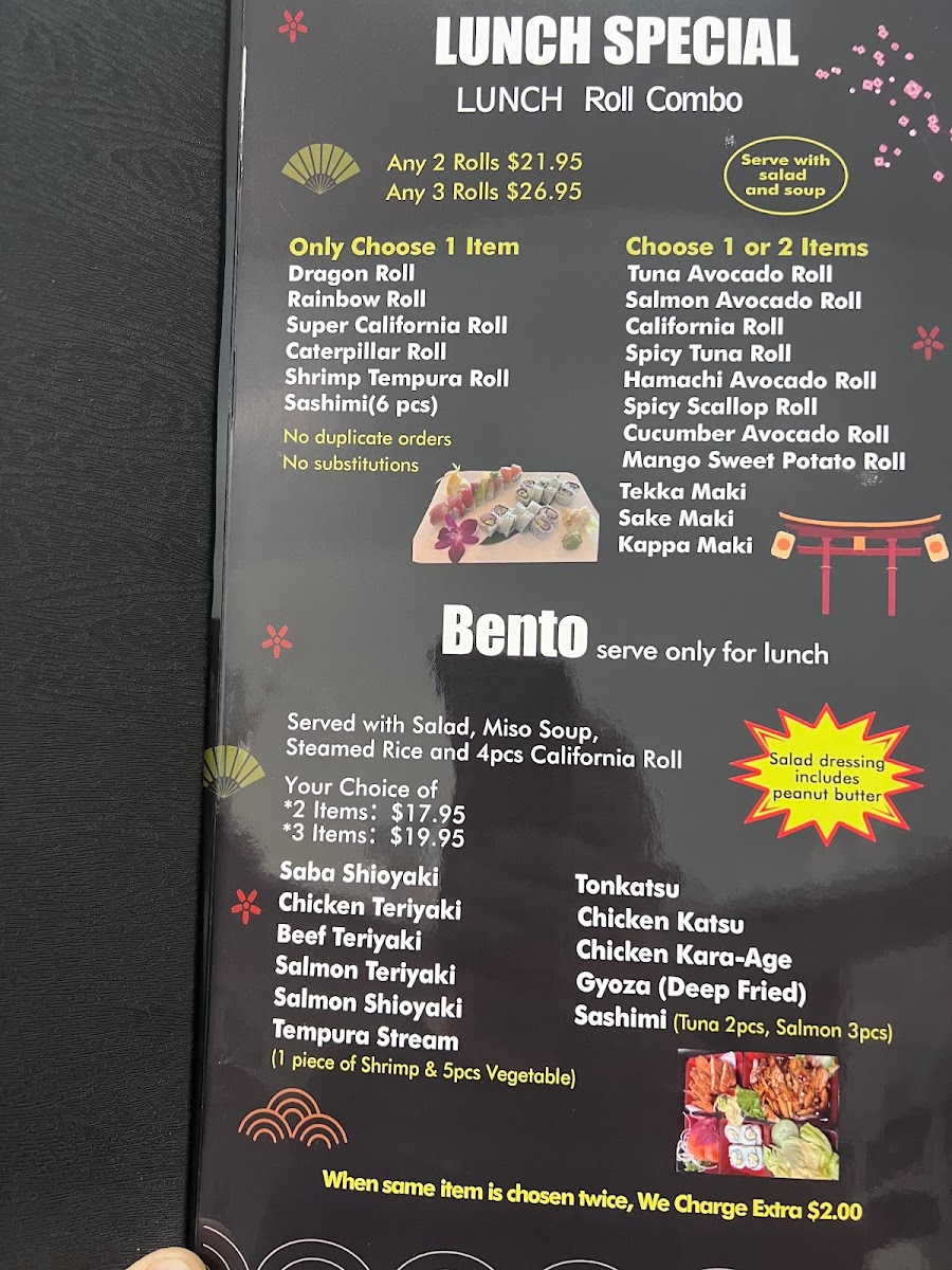 Two selected sushi rolls served with choices such as Dragon Roll, Rainbow Roll, or Sashimi (6pcs), and options like Tuna Avo Roll, California Roll, or Kappa Maki.